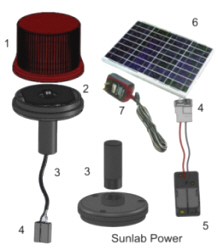 Base (3) para fixação através de parafusos ou encaixe em furo de 1" de diâmetro. Haste intercambiável para facilitar a instalação. A altura pode ser sob encomenda. Lente (1) em acrílico, emissor LED de alta potencia e varias cores.