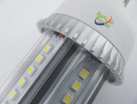 uma base de alumínio com encaixe tipo E27. Lente em PPMA - acrílica de alta